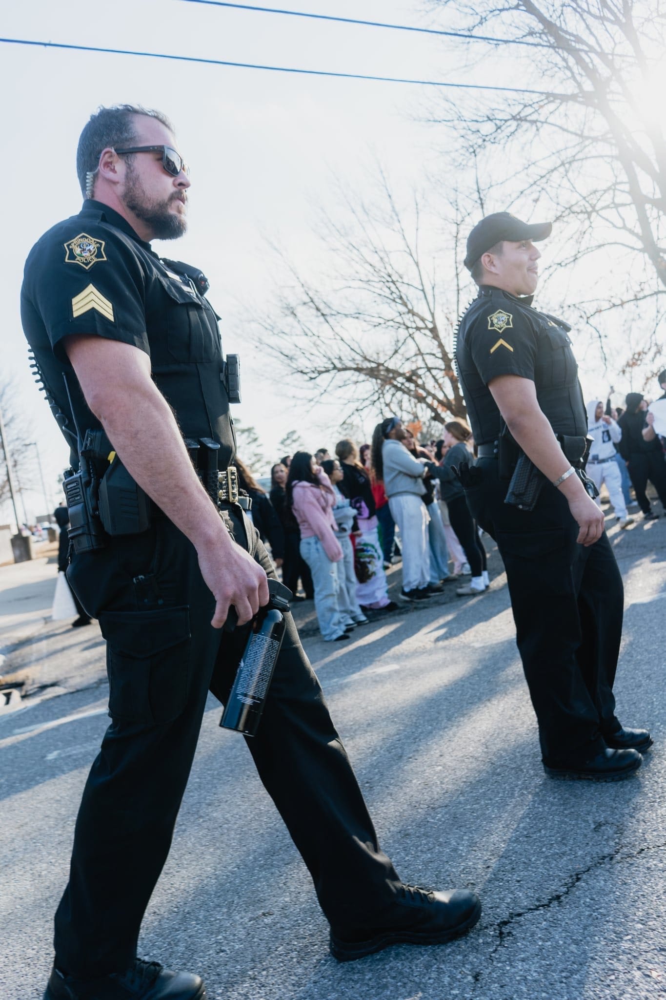 SPRINGDALE, Ark.—At least one Springdale Police Department officer was armed with pepper spray as officers observed high school students take part in anti-ICE walkouts on Tuesday, Feb. 3. Police did not deploy the pepper spray, but it is visible in one officer's hands in photos from the event provided to Arkansas GRITA. The pepper spray appears to be Sabre 5.0, which is sold only to "public safety agencies," according to Sabre's website.